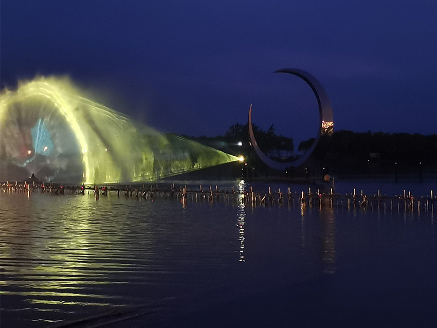 大縱湖旅游景區推出了東晉古城引云閣燈光藝術投影秀《印象·大縱湖》,將現代化的科技藝術思維與鹽城獨具特色的歷史文化、人文風情相結合,以裸眼3D效果和震撼的電影特效呈現一段全新的視覺盛宴,打造東晉水城光影新地標。